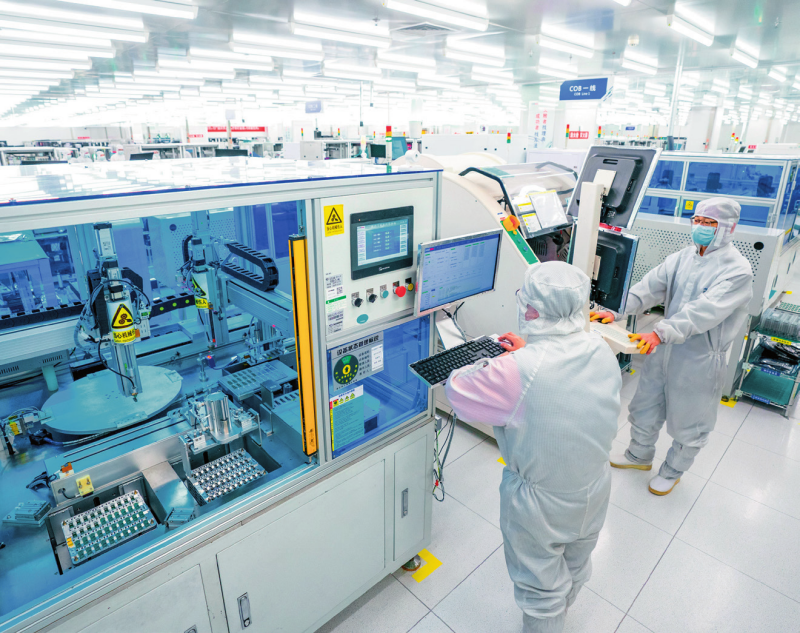 在位于武汉中国光谷的光电器件研发制造商——武汉光迅科技股份有限公司生产车间内,工作人员在光模块生产线作业(2024年2月5日摄)。肖艺九 摄