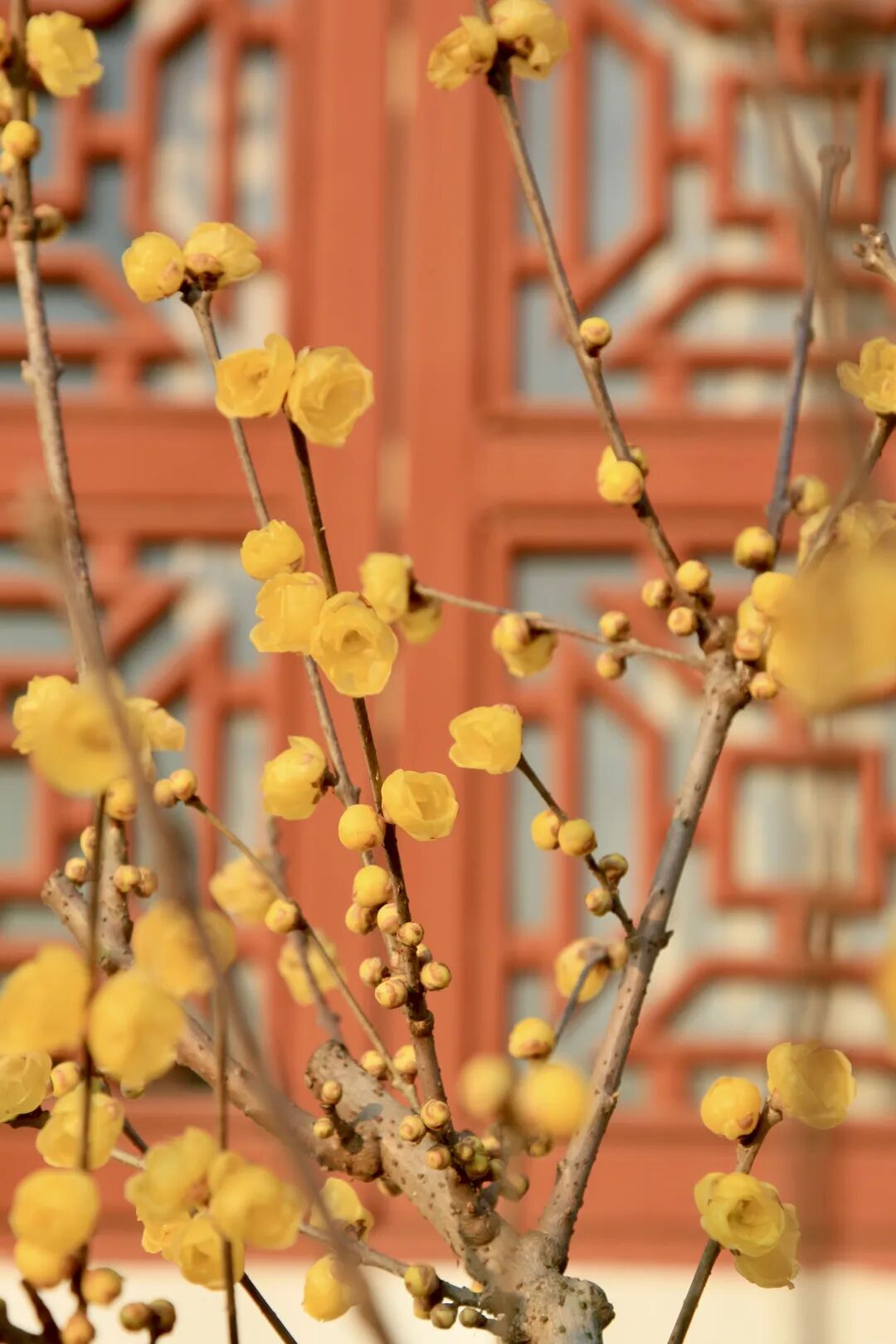 清雅的蜡梅与园内的中式建筑相映成趣。