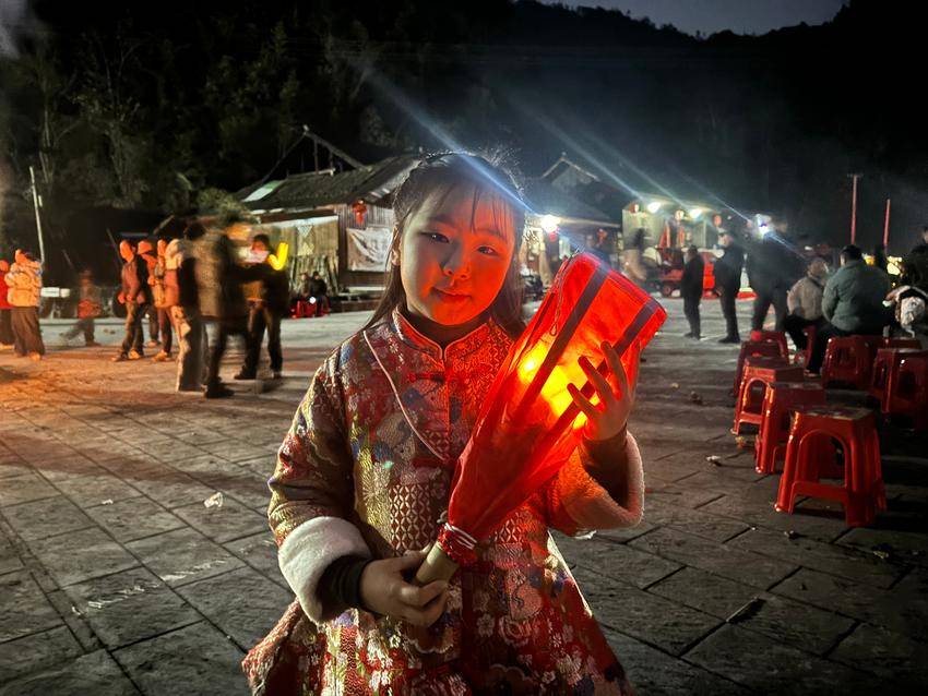 当夜幕降临,节日的核心——传统“托把灯”巡游与篝火晚会璀璨登场。村民们亲手用竹木、彩纸扎制的托把灯被逐一点亮,顷刻间,一条流光溢彩的“光河”蜿蜒于古寨之中。众人围拢着熊熊篝火,和着节奏欢快的音乐,尽情跳起摆手舞,以最热烈的方式抒发丰收的喜悦。孩童田梓潼兴奋地说:“村里今天来了好多人,热闹极了!”