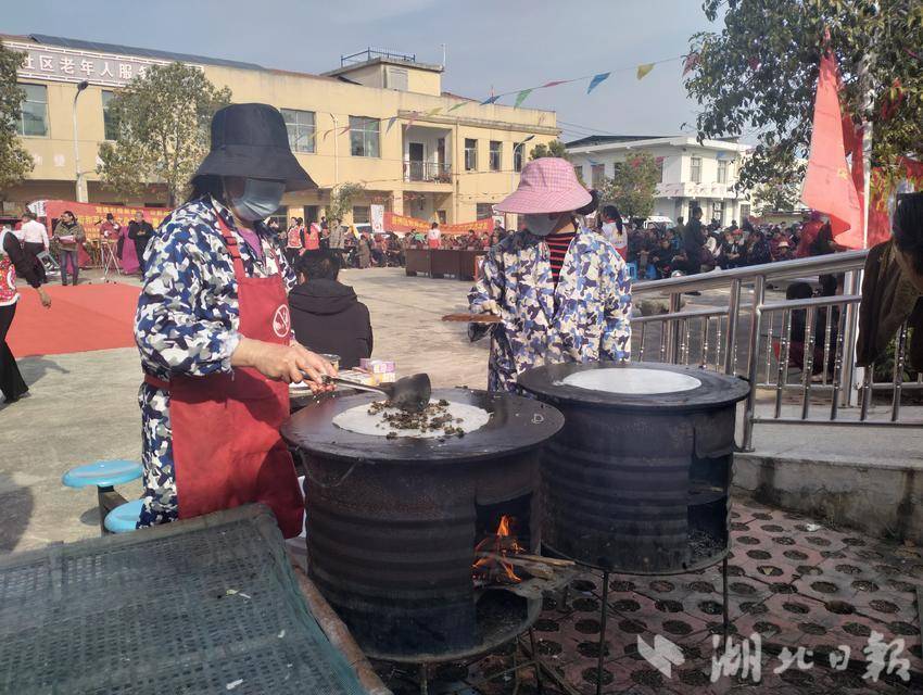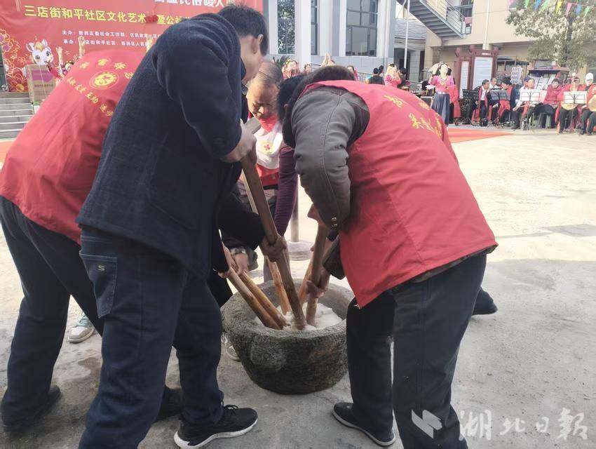民俗体验区也是香气四溢、热闹非凡。手工豆丝、打糍粑、炸粑等民俗活动同步开展,煎至微微金黄的豆丝饼散发着诱人的香气,众人齐心协力用力敲打石臼里的糍粑,刚从油锅里捞出的炸粑还冒着热气。这些传统民俗活动吸引了不少社区居民驻足围观并积极参与。居民们一边亲身体验民俗活动的乐趣,一边品尝着刚出锅的美食,在闲聊谈笑中,于糯米香与欢笑声里,深切感受传统文化的独特魅力。