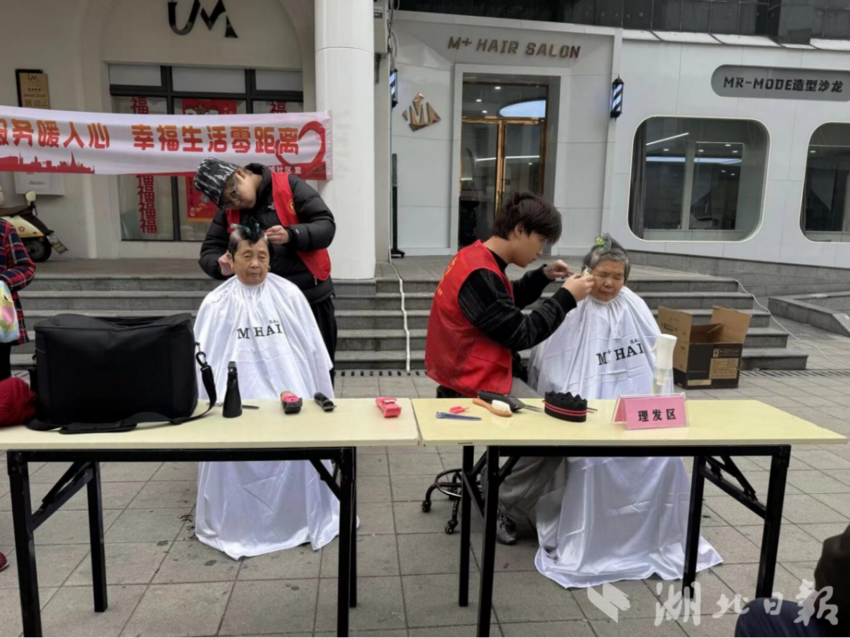 保利商业街作为辖区核心便民阵地,覆盖全年龄段居民,具备集中服务的天然优势。新城社区打破商业经营与便民服务的壁垒,联合社区志愿服务队与M+hairsalon理发店、醉得意、湖北银行、小二推拿等爱心商家,并联动开锁师傅、磨刀师傅、裁缝师傅等手艺人,共同打造“商业+便民”沉浸式融合服务场景。