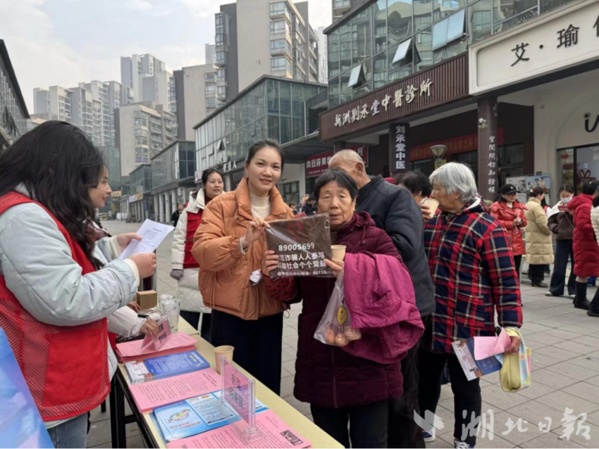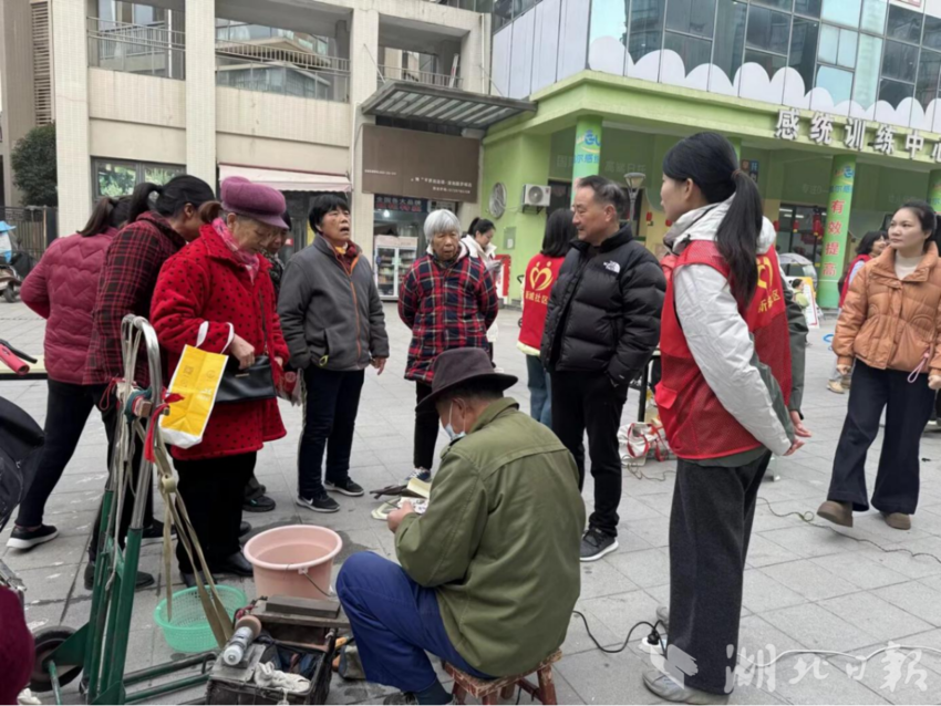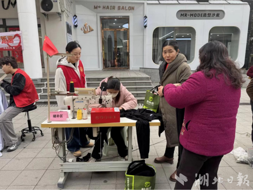 在便民维修区,缝纫师傅现场为居民解决衣物缝补、纽扣更换、拉链维修等“小麻烦”,用精湛手艺化解居民生活中的“小困扰”。在健康服务区,湖北银行工作人员现场为居民解答社保医保、反诈防骗等政策疑问,发放宣传资料。