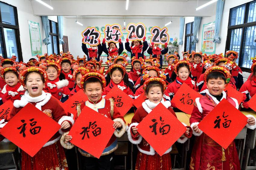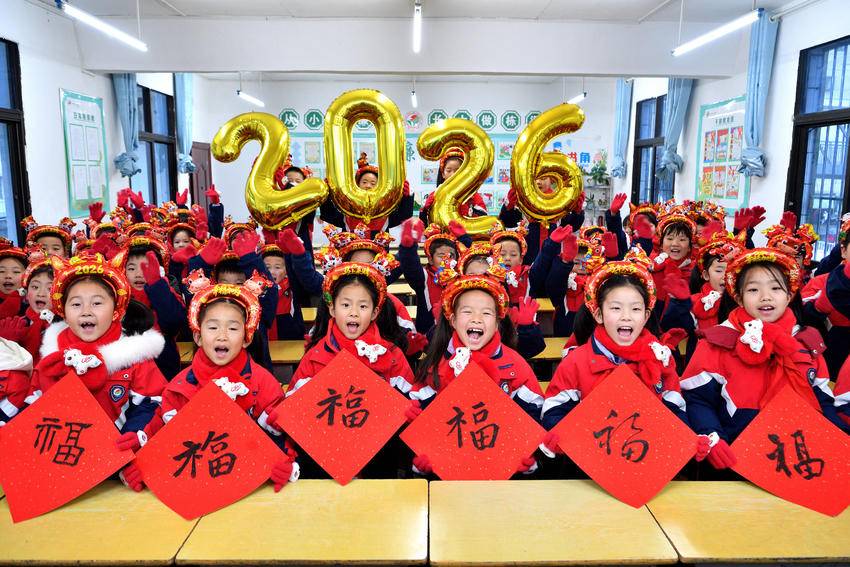 保康县实验小学的迎新氛围同样热烈。学生们整齐列队,有的跳起欢快的新年手势舞,有的手举鲜艳的“福”字和“2026年新年快乐”标语牌,用充满仪式感的方式迎接新年。“新年到 福气到 平安喜乐没烦恼”“迎新年 事事顺 天天开心样样好……”一声声清脆响亮的新年祝福,回荡在校园的每个角落。