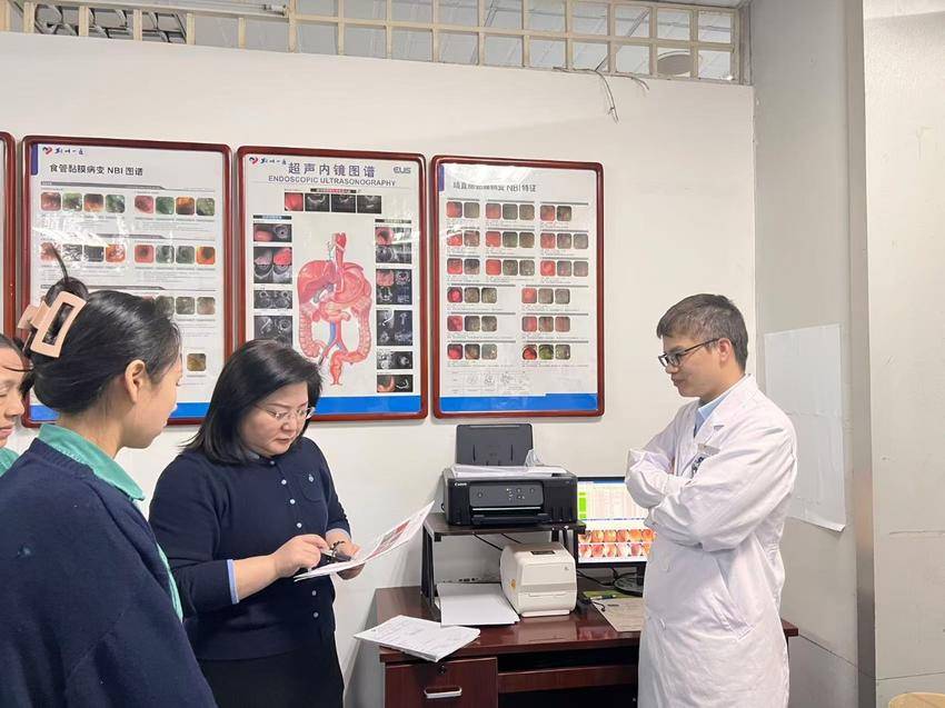 汇报结束后,专家组深入消化内镜中心开展实地检查。专家组细致核查了中心布局流程、设备配置、消毒灭菌、感染防控、操作规范、应急预案及医疗文书书写等关键环节,与现场医护人员深入交流,详细询问日常操作细节及质控要点落实情况,对中心规范有序的工作流程、严谨细致的感控管理给予充分肯定。