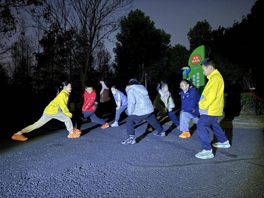 晨跑结束后,志愿者们开展集体拉伸,肩颈放松、腰背