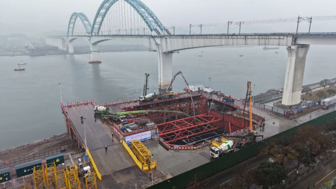 据悉,此次承台浇筑将分两次进行,首次浇筑高度为4.05米。为保障连续作业,施工方依托南北两岸的智能化混凝土拌合站进行集中供料与调度,计划通过持续两天两夜的不间断施工完成浇筑,随后即可转入主塔塔身的高空施工阶段。