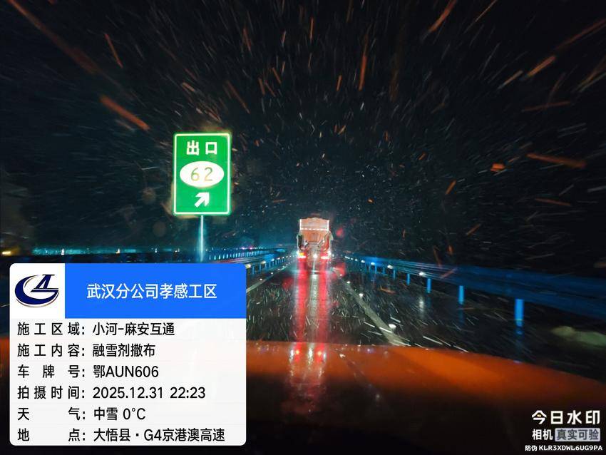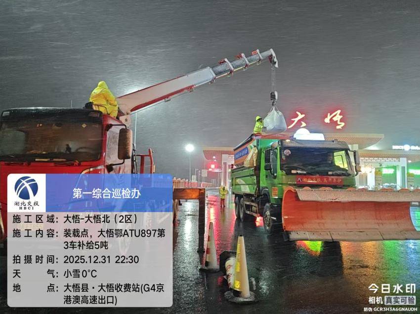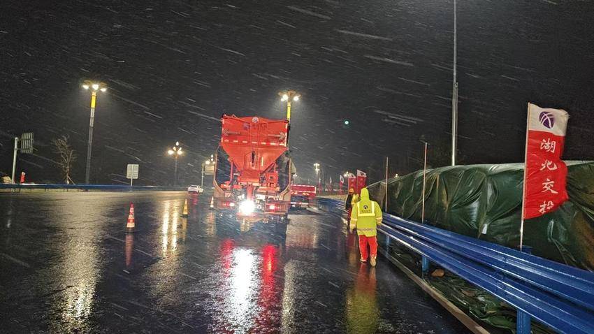 跨年夜的钟声里,坚守从未停歇。22时35分,大悟北至九里关出现大雪,气温跌至零度,凌晨时分,孝昌至小河段大雪,防冻防滑作业进入白热化阶段。二区大悟-大悟北完成第二轮撒布作业,五区在孝昌与小河溪之间循环作业;路警联合开展“压速带道”,用警灯为过往车辆指引方向;运行监测组实时巡查上报路况,收费站LED屏实时更新通行信息,多方联动如同精密的齿轮,环环相扣、高效运转。