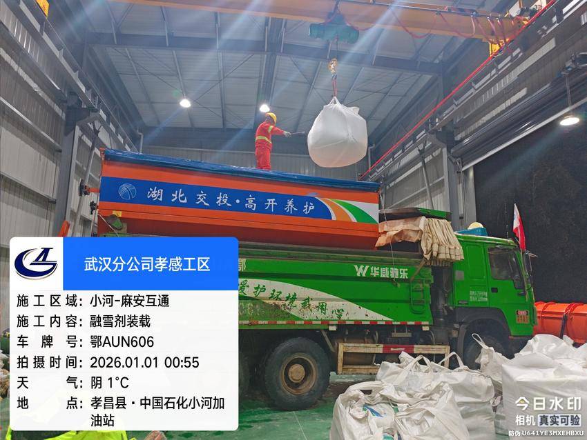 20 时16分,大悟以北转为中雪,气温骤降至零度以下。六区孝感至孝昌、五区小河至孝昌的作业车辆陆续满载融雪剂奔赴一线,三区、四区在小河仓库同步完成物资装载,形成“分区作战、全域覆盖”的作业格局。针对桥梁、互通、长下坡等易结冰路段,作业车辆特意降低行驶速度,加大融雪剂撒布厚度,确保“雪降即撒、雪停路净”。