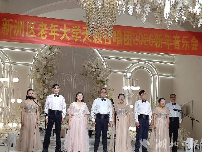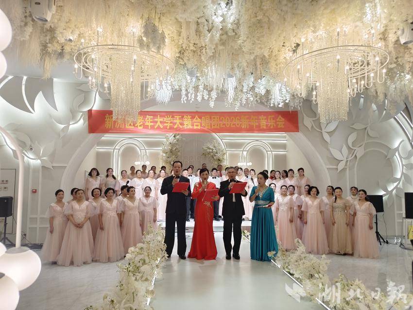 12月30日,新洲区老年大学天籁合唱团2026新年音乐会在政和玺宴酒店宴会厅举行。新洲区文化馆、区老年大学主要负责人以及特邀嘉宾亲临现场,与70余名合唱团师生齐聚一堂,共同见证这场充满热爱与活力的音乐盛会。