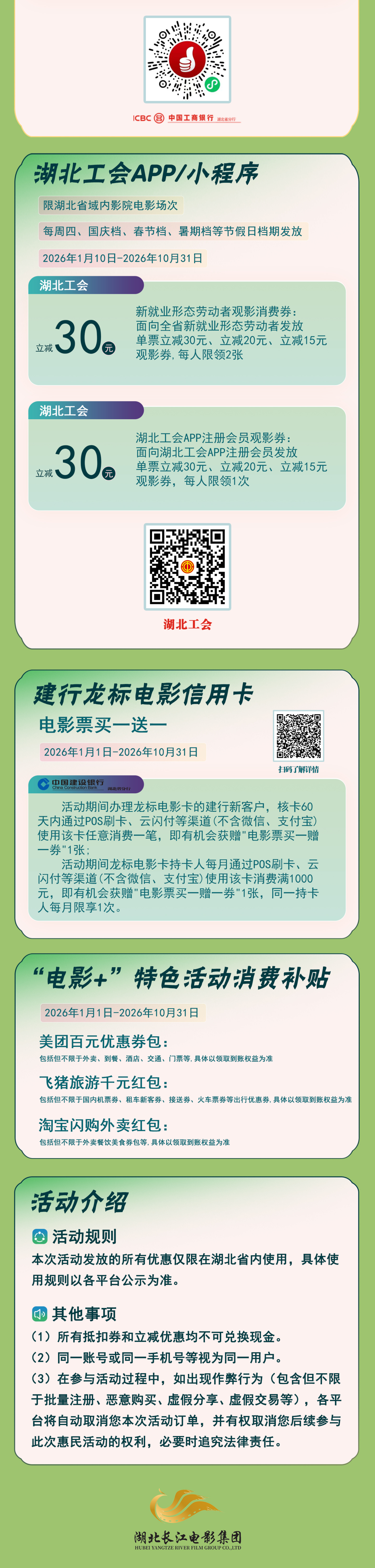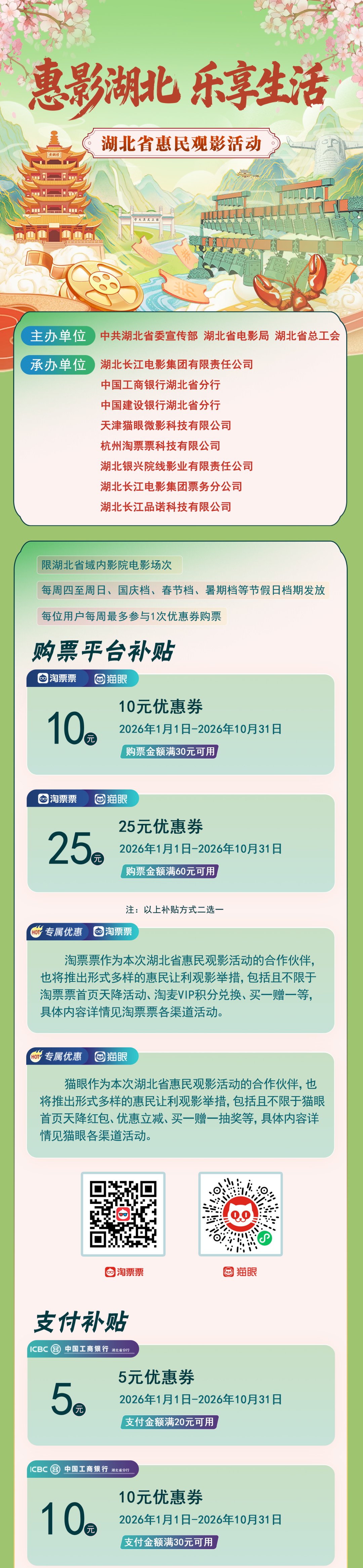 本次活动由湖北省委宣传部、湖北省电影局、湖北省总工会主办,湖北长江电影集团、湖北工商银行、湖北建设银行、天津猫眼微影科技有限公司、杭州淘票票科技有限公司、湖北银兴院线影业、湖北长江品诺科技公司承办,旨在构建更普惠、更精准、更具活力的“电影+”多元消费场景,持续激发电影消费潜力,助力湖北电影市场繁荣发展和消费提振升级。