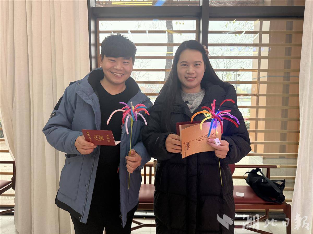 据了解,元旦上午,为满足新人领证需求,湖北多地婚姻登记处“为爱加班”。为丰富新人体验,武昌区民政局婚姻登记处现场还举办了“扭结同心,烟火年年”主题活动,新人现场共同制作扭扭棒烟花,体验非遗婚书拓印、集体颁证仪式等。