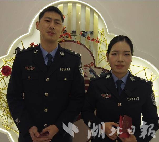 办理结婚登记的新人中,身着警服的付紫荆和孙晨宾格外醒目。