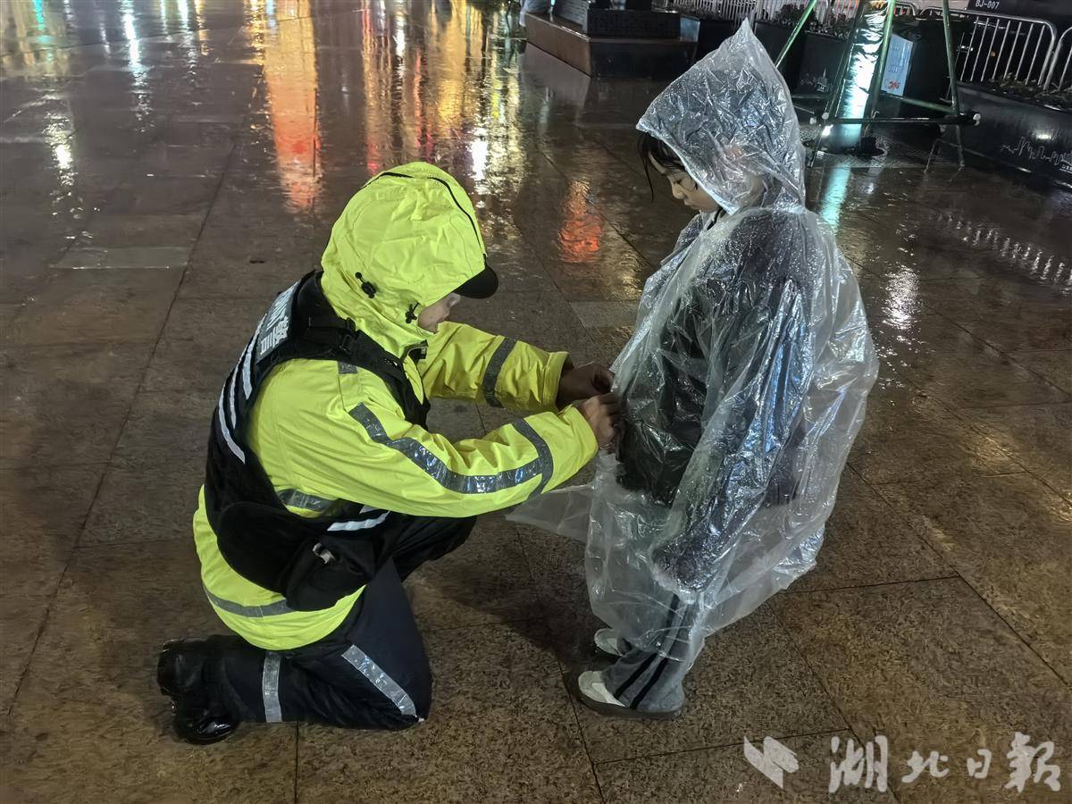 暖心守护,在雨夜处处可见。21时许,反恐怖和特警支队民警贺智伟在沿江大道中国工商银行旁巡逻时,发现一名9岁女孩独自在雨中徘徊。贺智伟迅速上前,蹲下身来为浑身湿透的女孩穿上雨衣。贺智伟一边陪着女孩在安全区域等候,一边通过指挥平台联动查找女孩家属,经过一个多小时的努力,终于在新年钟声敲响前,成功帮助女孩与家人团聚。江汉区分局反恐怖和特巡警大队巡逻至江汉四路时,也帮助一名走散的小朋友与母亲重聚。