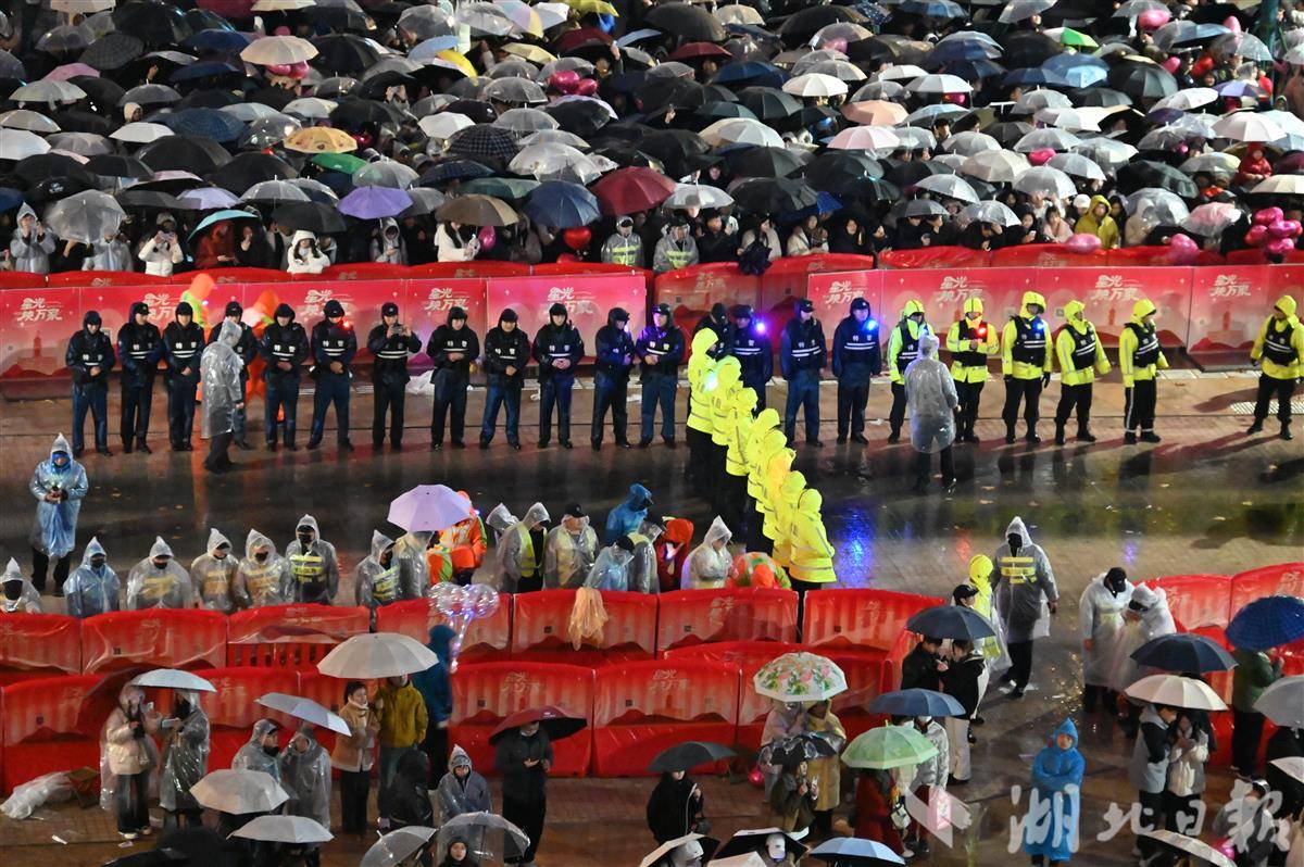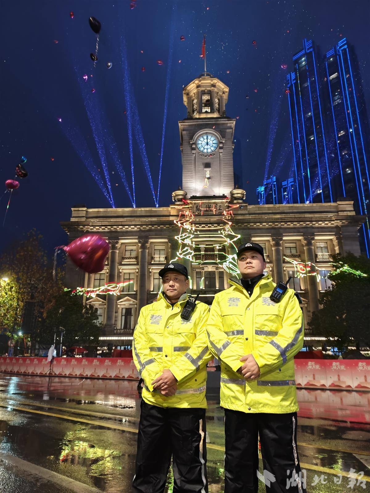 当晚,江汉路步行街不少市民游客撑伞出行,霓虹灯光与流动的伞影交织形成了独特的街景。为应对雨夜跨年的大客流,武汉警方按照“统一指挥、以块为主、条块结合、圈层管控”的工作原则,在江汉关、光谷等重点区域,分时分点设置固定岗和流动巡控力量,提前布设导流设施和隔离装备,规划单向通行路线与安全缓冲区,确保活动现场安全可控。