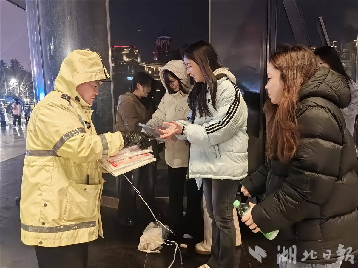 在汉口江滩,持续的冬雨让未带雨具的群众有些狼狈。面对群众的求助,水上分局四大队民警喻武安立即联系指挥部,将所有民警辅警配备的一次性雨衣全部调至江滩大门,逐一发放给没有雨具的群众,赢得现场一片感谢声。与此同时,水上公安还在江滩沿线15个闸口和3个码头加密巡逻频次,部署3艘巡逻艇在长江、汉江江面来回游弋,严格落实码头、轮渡等场所的安全检查和应急预案,筑牢水上安全防线。