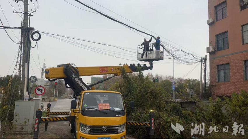 湖北日报讯(通讯员刘旻硕、郑婧彤)近日,为消除“空中乱线”带来的安全隐患与视觉杂乱,做好谌家矶大道、解放大道下延线、汉口北大道等主干道“空中蜘蛛网”梳理拔除工作,长江新区城管局迅速行动,一周内完成规整清除。