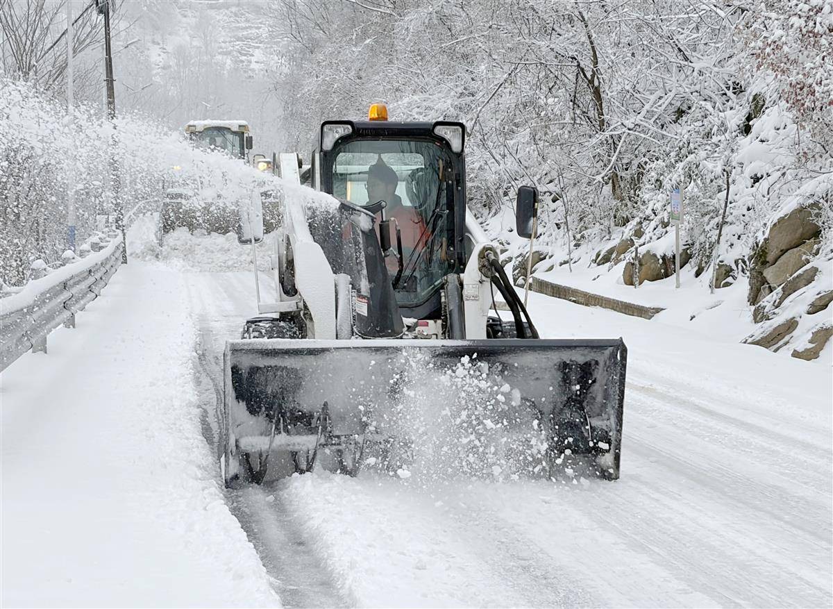 在红岩寺路段,“山猫”除雪机与铲车协同作业,养护人员手持铁锹、雪铲清理路侧积雪和残留薄冰,融雪剂撒布车紧随其后,均匀铺洒融雪材料,除雪工作高效推进。
