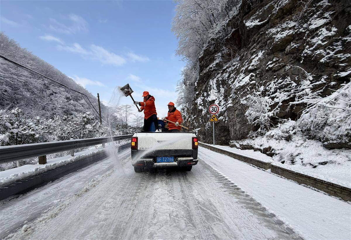 受近期寒潮影响,2025年12月31日,保康县迎来大范围降雪,海拔1200多米的红岩寺路段路面结冰,影响车辆通行安全。保康县公路事业服务中心闻雪而动,立即投入除冰保畅工作。
