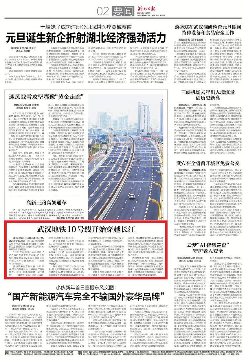 2026年1月2日,湖北日报要闻版报道武汉地铁10号线越江盾构始发。
