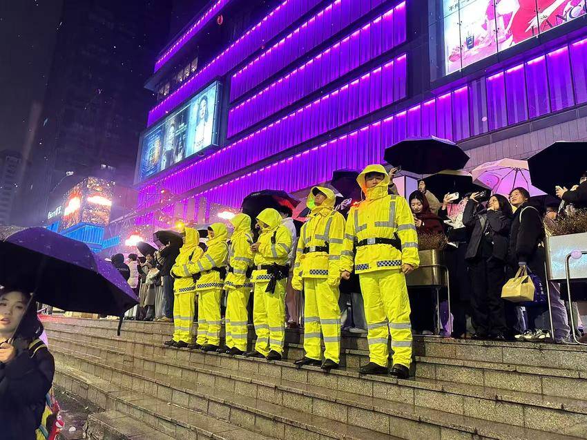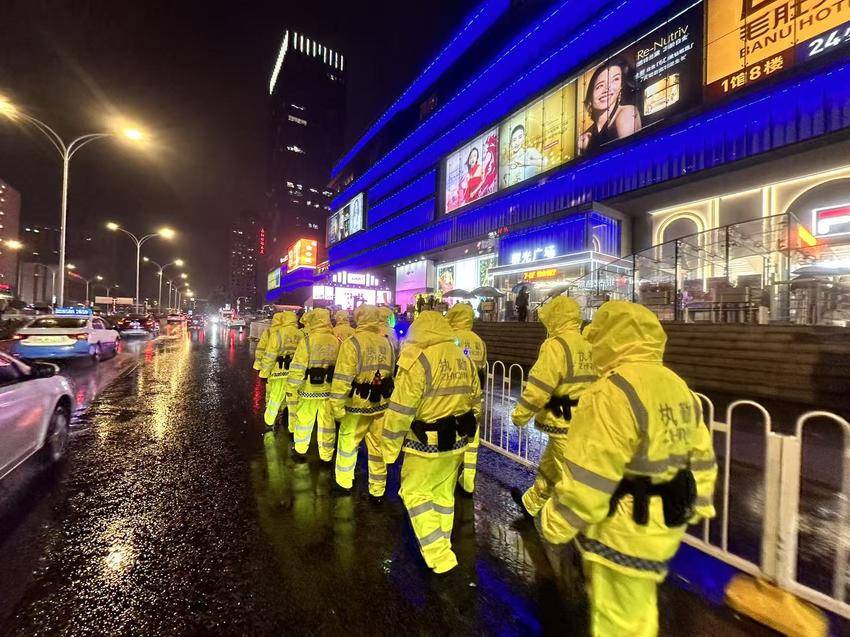 2025年12月31日傍晚,城市霓虹渐次亮起,细密的雨丝洒落街头。在街道口等繁华商圈,巡特警队员身着雨衣穿梭在人流中。他们三人一组,步伐整齐,目光敏锐地巡视四周,雨水打湿了帽檐,却丝毫未影响他们守护平安的专注,让过往行人与游客倍感踏实。“看到警察在,哪怕下雨逛街也安心多了。”一位牵着孩子的母亲笑着说。