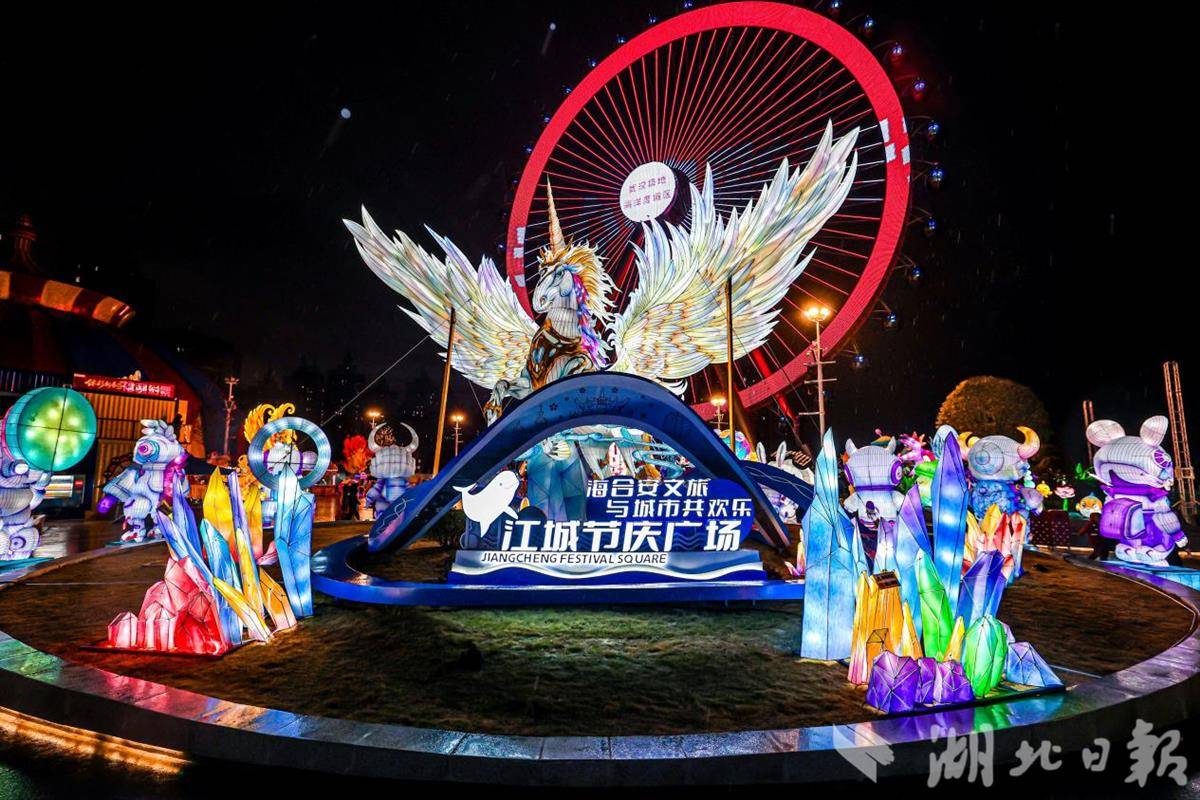 园区互动体验精彩纷呈,NPC与游客玩梗斗舞、复刻经典名场面;高颜值NPC化身新年惊喜官,以趣味游戏、合影打卡,送上浪漫跨年奇遇;非遗玩趣市集热闹非凡,投壶、蒙眼敲锣等传统游艺趣味十足;现场非遗海洋花灯流光溢彩,10米巨型飞马吸睛夺目,三大主题区光影交织,吸引游客纷纷打卡合影留念。
