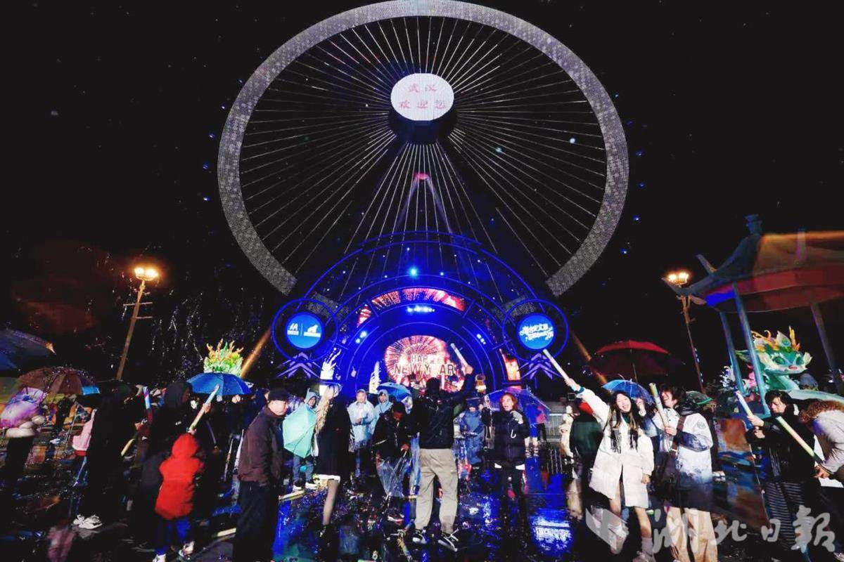 作为跨年夜的压轴重头戏,当天,楚天之眼摩天轮20:00至24:00面向全民免费开放,游客们纷纷登上摩天轮,云端视角俯瞰武汉夜景。当零点将至,全场游客齐声倒计时,共同迎接2026年第一秒。
