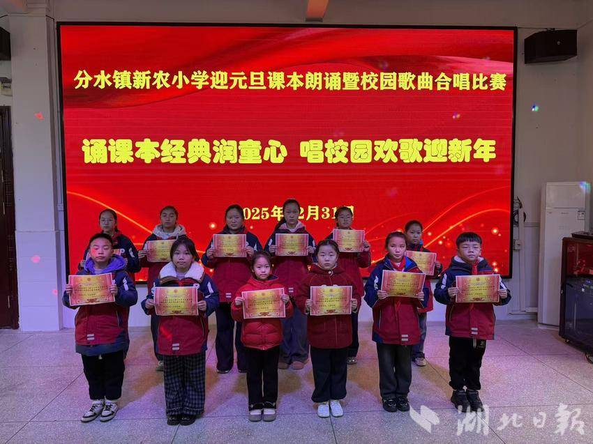 湖北日报客户端讯(通讯员邓勇军)元旦前夕,汉川市分水镇新农小学举行“诵课本经典润童心,唱校园欢歌迎新年”课本朗诵暨校园歌曲大合唱比赛。