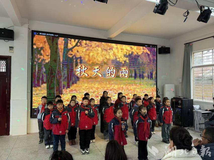 比赛在一年级小朋友清脆的歌声中拉开序幕。从低年级学生充满童趣的《蜗牛与黄鹂鸟》《虫儿飞》,到高年级学生饱含深情的《少年中国说》《为中华之崛起而读书》,12个班级依次登场。孩子们或声情并茂地朗诵课文,或激情昂扬地合唱经典,用声音传递文字的温度,用歌声唱响童年的梦想。观众席上,家长们神情专注,不时举起手机记录精彩瞬间,掌声与喝彩声此起彼伏。