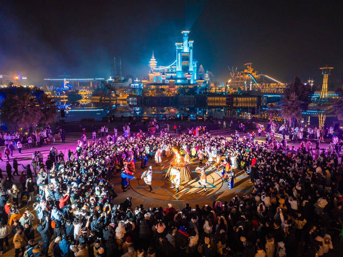 除了烟花,园区内的凯旋广场也会上演万人篝火晚会,跳动的火苗与欢快的旋律交织,游客们手拉手载歌载舞,以最传统温暖的方式欢度新年。另外,景区内更有百余项游乐体验日夜狂欢,“达芬奇飞翔”宽翼过山车、“星际历险”7D飞行影院、“雪山飞车”转轨过山车等经典项目前排起长队,游客们在尖叫声中释放激情;“时来运转”“淘金风暴”等趣味盎然的“银票”游戏为游客提供多样化娱乐选择。与此同时,“昆仑幻境”主题区的“楚天巨焰”篝火灯组也成为游客打卡的热门,熊熊燃烧的火焰寓意新年红红火火。
