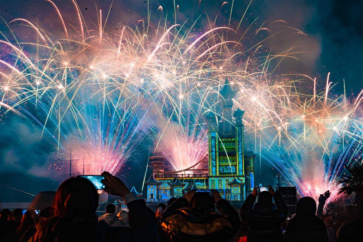 当夜幕降临,奇幻谷的狂欢达到高潮。“星云会馆”城堡化身为奇幻画布,光影流转间,襄阳古城、古朴钟楼、麒麟献瑞、新年祝福等画面依次呈现,每一幕都令人惊叹。霎时间,绚丽烟花如星河倾落,七彩光芒铺满天幕……夜幕下,万名游客手持礼花棒、齐声倒数,礼花与烟花同频闪耀,将现场气氛推向最高潮。据悉,奇梦城堡光影秀将于1月1日至3日连续3晚绽放。