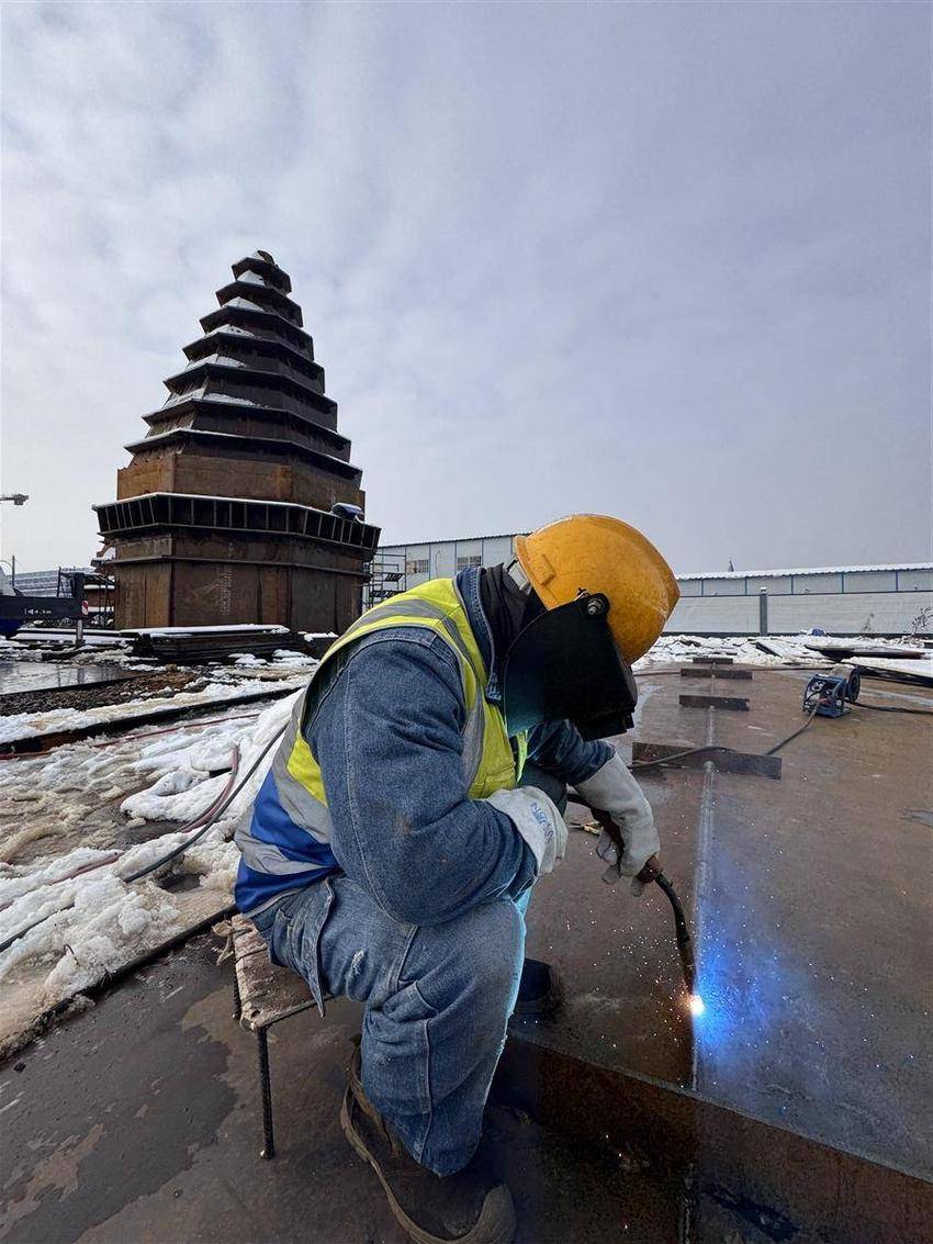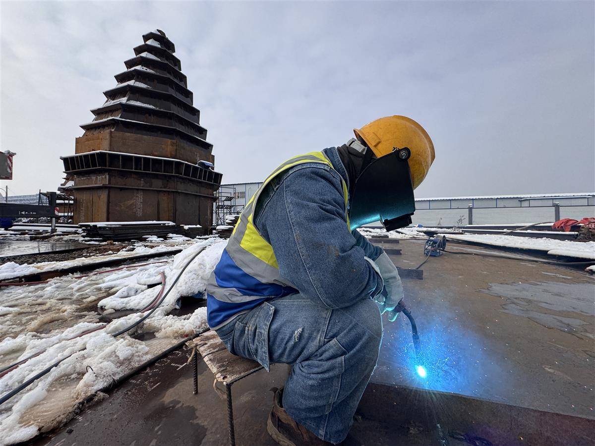 从早上七点到下午五点半,除去中午吃饭、休息的时间,杨充平每天要在板凳上坐八九个小时,仔细完成每一条焊缝。今年元旦假期,他没有回家团聚,而是留在建设现场,加班加点抢工期、赶进度。