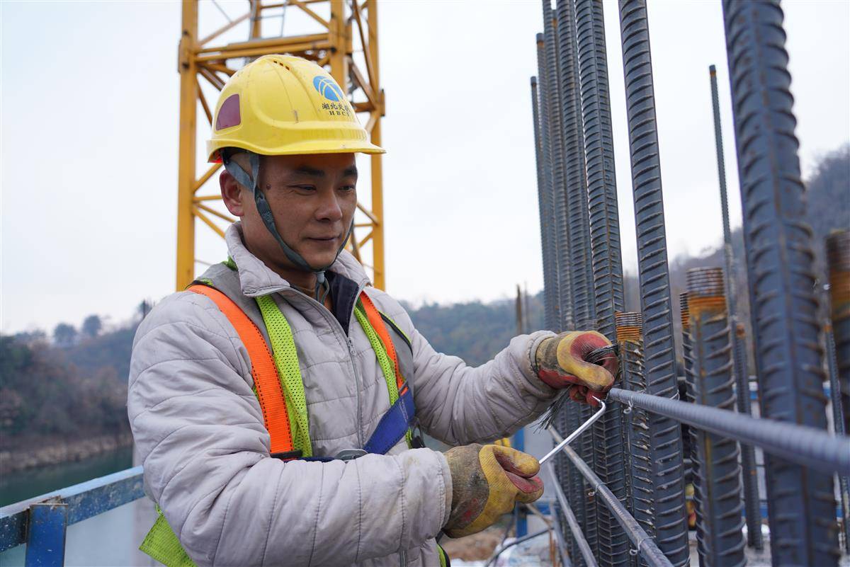 6号桥墩上,40岁的钢筋绑扎工张海兵头戴安全帽、系紧安全带,在纵横交错的钢筋骨架间专注作业。