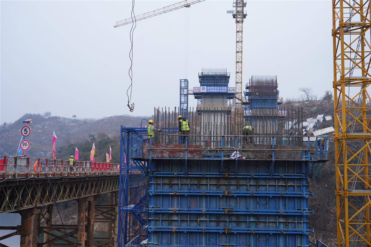 全长532米的云台山水库大桥是平宜高速襄阳段控制性工程,6号墩高43米,是该桥的两个主墩之一,目前正在进行第三节模板的钢筋结构施工。