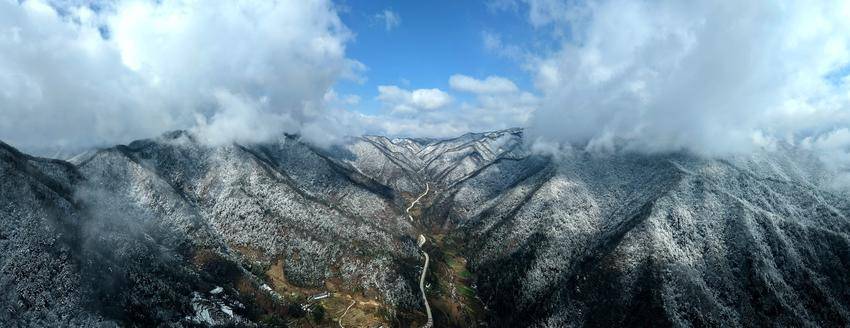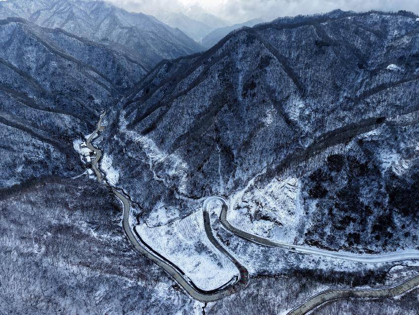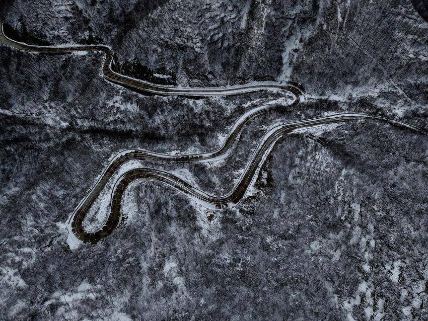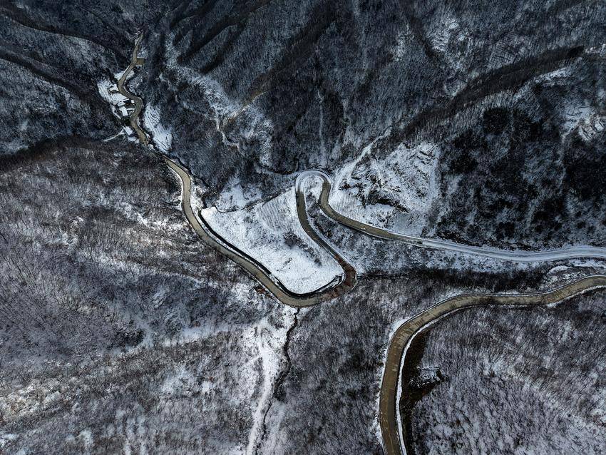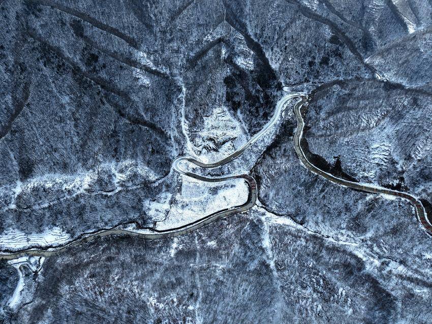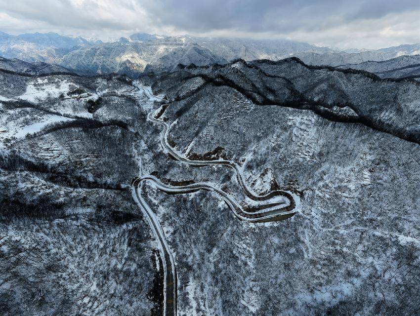 湖北日报客户端讯(通讯员 钟建华、赵永生)瑞雪迎新,山河换妆。2026年1月1日,新年第一天,湖北宜昌兴山县水月寺镇锻树垭村七里山迎来今冬首场降雪。雪后初霁,无人机升空俯瞰,只见层峦叠嶂间银装素裹,山脊如墨、雪色似宣,蜿蜒山路隐于苍茫林海,一幅雄浑壮阔的“冬日山川水墨画”在天地间徐徐展开。