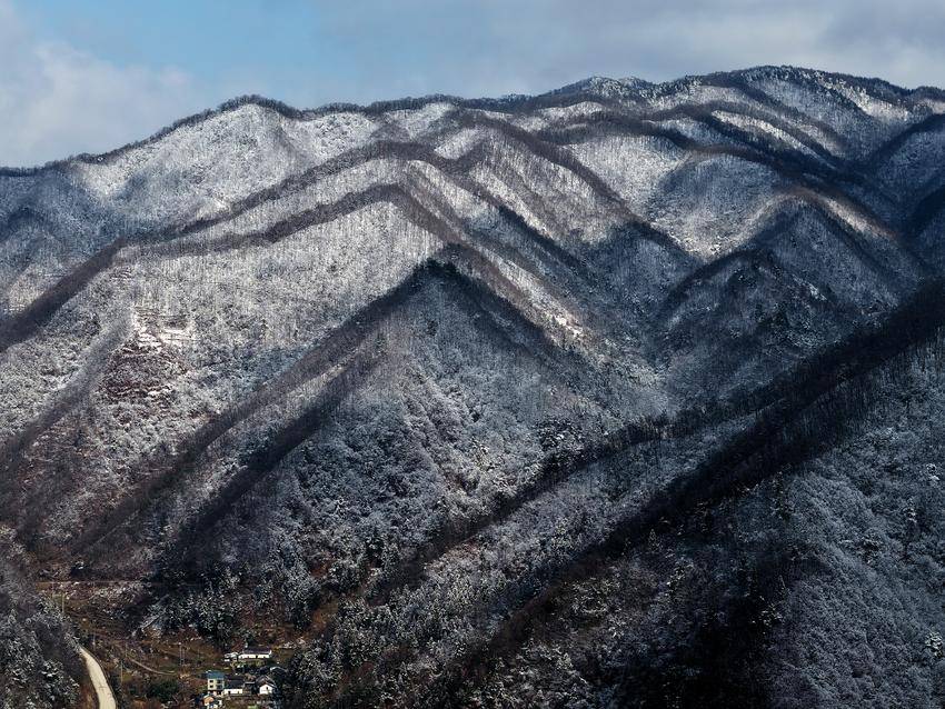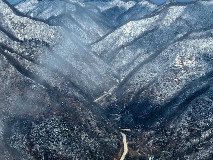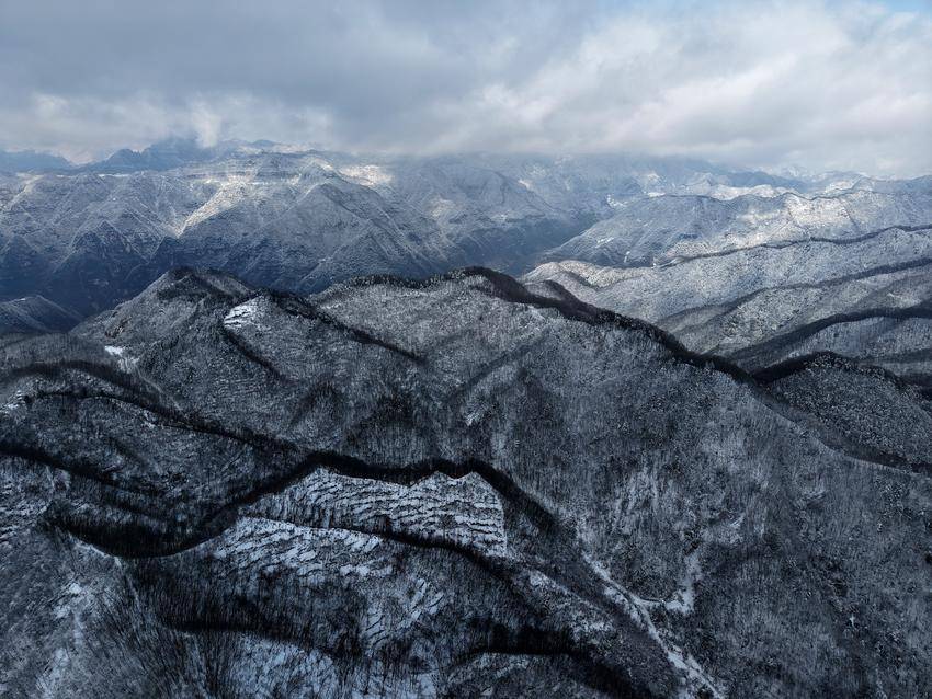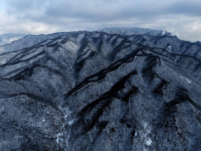 当日清晨,随着冷空气南下,七里山片区飘起细密雪花,至午后雪势渐停。阳光穿透云层,为覆盖着皑皑白雪的群山镀上一层柔光。从空中望去,海拔千米的七里山被冬雪彻底“唤醒”:千沟万壑间,积雪沿山势铺展,勾勒出山脊的硬朗线条,墨色的岩石与深绿的松林在白雪映衬下,宛如国画中的“斧劈皴”与“披麻皴”,笔触遒劲而灵动;山间的松柏挂满蓬松的雪团,似玉树琼枝,偶有山风拂过,雪沫簌簌落下,为静谧的山林添了几分动态。