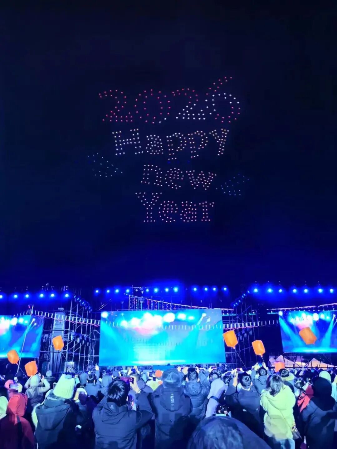 近万名游客在木兰不夜城跨年迎新观看无人机表演。