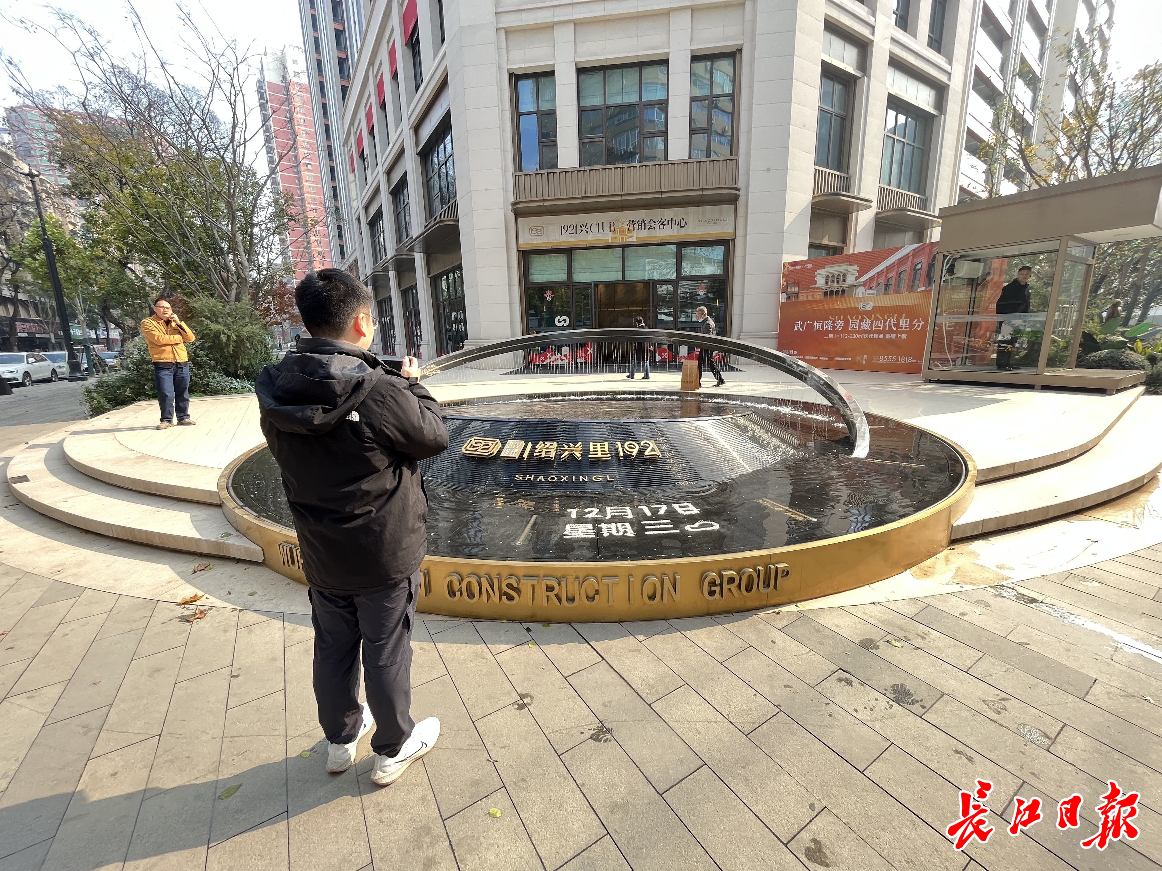 绍兴里门口的时光之环水景内,12个刻度环绕,咸安坊、同兴里等特色里份与建造年份一一呈现,仿佛在诉说着往昔的故事。复古红砖墙建筑前,年轻人纷纷驻足拍照,感受这份独特的韵味。