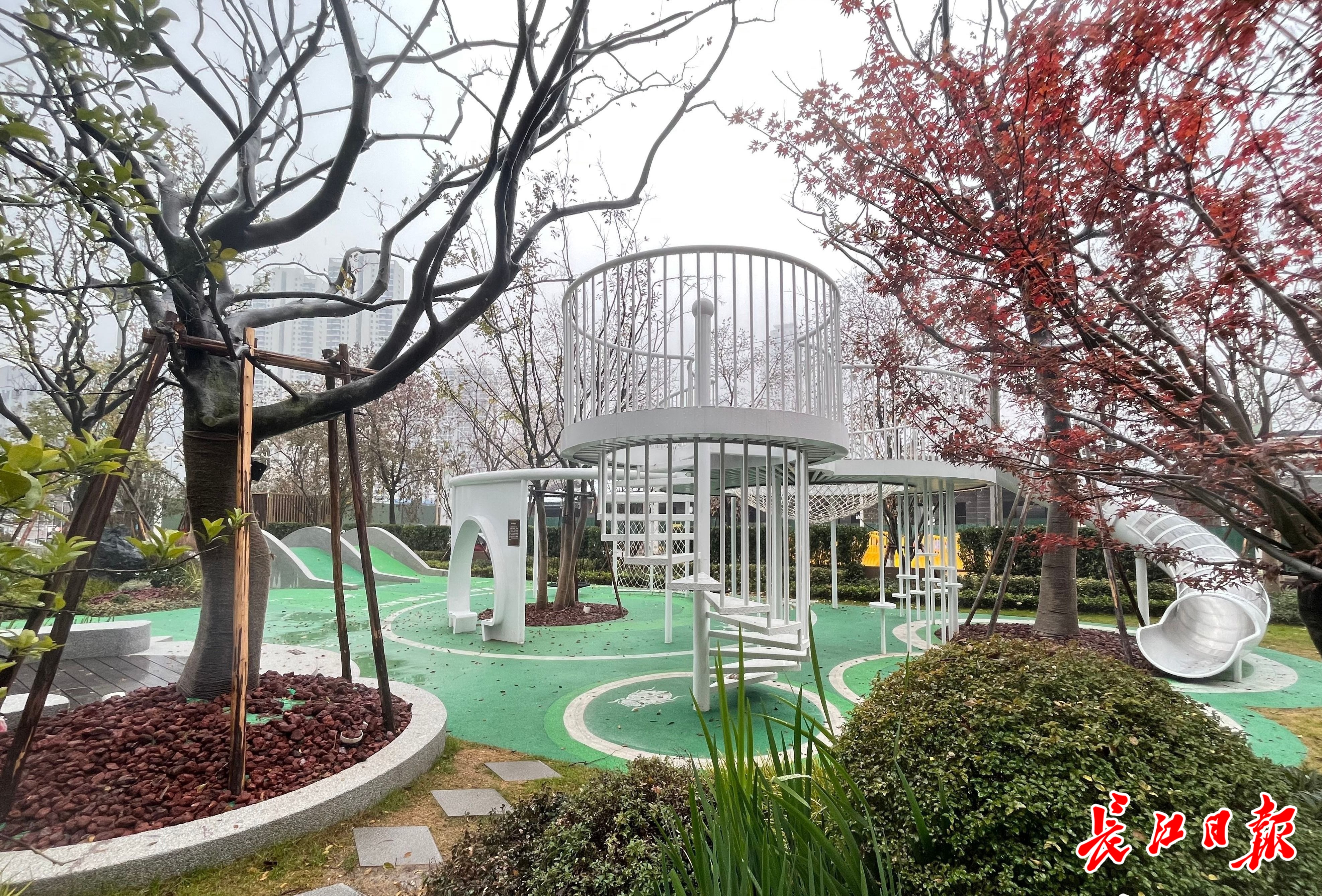 记者在现场看到,开放式的儿童乐园里,漂亮的霓虹灯架形成入口,木质小桥、草坪地垫滑道、铁艺滑梯和攀爬架等设施一应俱全,火红的乌桕林围绕在周围。刘丽楠说,夏天这里成了居民最喜欢的休闲纳凉点、遛娃聚集地,每天晚上这里都围满了附近居民,大人聊天,孩子玩耍,让人放松又舒服。