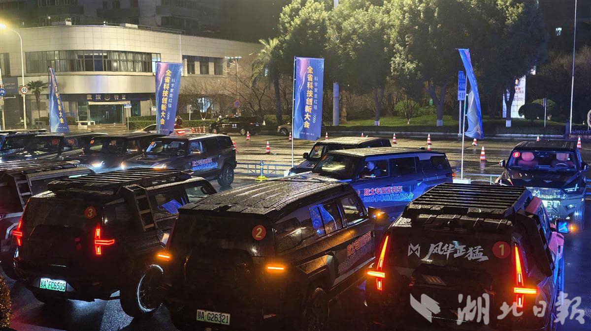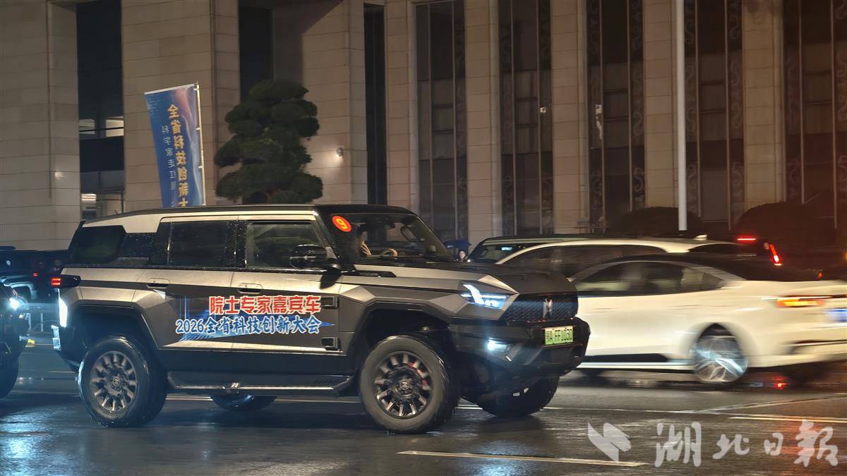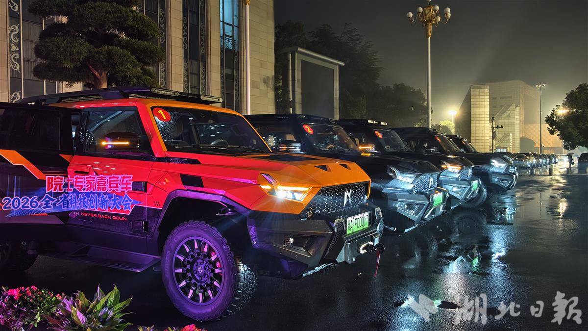 1月4日,湖北2026全省科技创新大会在武汉洪山礼堂隆重召开。会前,主办方以“最猛的车迎接最牛的人”——12辆国产东风猛士越野车礼遇12位科学家驶入会场,传递对科学精神的至高尊崇。(湖北日报全媒记者 陈少哲 摄)
