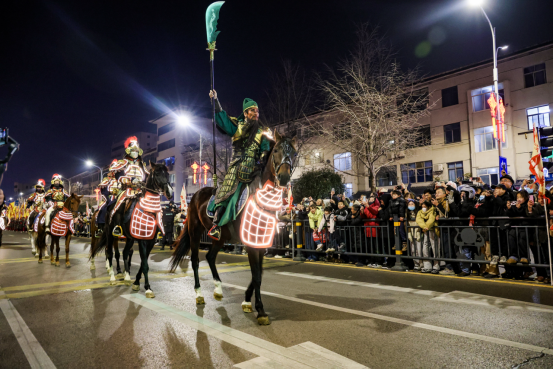 在古城东门,由2026架无人机组成的“万马奔腾”主题大秀,将新春的祝福与科技美学写满夜空。金甲“关羽”率队策马巡城,威严的仪式感与夜空中的光影奇观,共同完成了现代科技与历史图腾的跨时空对话。