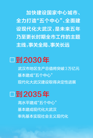路虽远,行则将至。2030年,武汉市地区生产总值将突破3万亿元,基本建成“五个中心”,现代化大武汉建设取得决定性进展;到2035年,高水平建成“五个中心”,基本建成现代化大武汉,率先基本实现社会主义现代化。