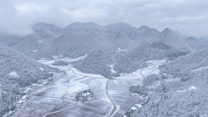 湖北日报客户端讯(通讯员辛琰、黄宇)1月5日,小寒如约而至,雪后的鹤峰县燕子镇,成了银装素裹的世外雪乡。从高空俯瞰,四周群山环抱的平野间,厚厚一层白雪均匀铺展,像被上天洒下的皎洁绸缎,将田野裹得严严实实。青黛色的山峦褪去了往日的苍翠,换上雪白的绒衣,山间云雾缭绕,似轻纱漫舞,将雪岭勾勒得朦胧又雅致,每一处景致都透着冬日独有的清冽与静谧。