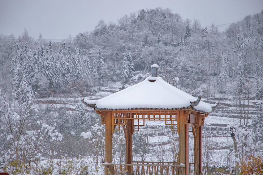 漫步山乡,冬日的诗意在眼前铺陈开来。路旁的树木褪去了枝叶的遮掩,枝桠上或堆满蓬松的积雪,或凝结着晶莹的冰条,风一吹,雪沫簌簌飘落,折射出细碎的光。古朴的木质小亭静立在雪色中,屋顶覆着一层蓬松的白雪,仿佛戴了顶厚实的棉帽,与周围的雪景相映成趣。