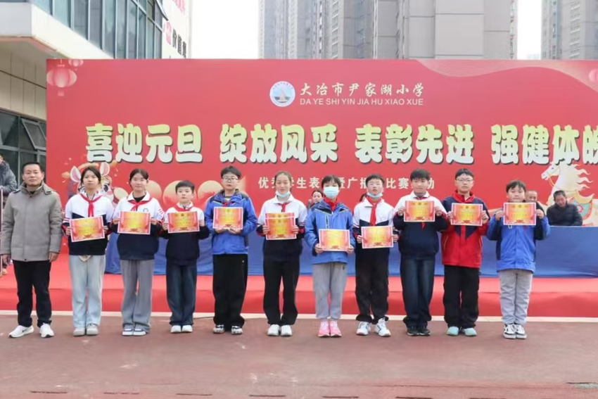 湖北日报客户端讯(通讯员刘珊、李佳慧、陈帅)“一、二、三、四!”嘹亮的口号响彻操场,整齐的步伐踏响了冬日的节拍。近日,大冶市尹家湖小学“喜迎元旦 绽放风采”优秀学生表扬暨广播操比赛活动热烈举行,全体师生齐聚操场,在跃动的节奏与热烈的掌声中,共同迎接新年,尽显少年朝气。