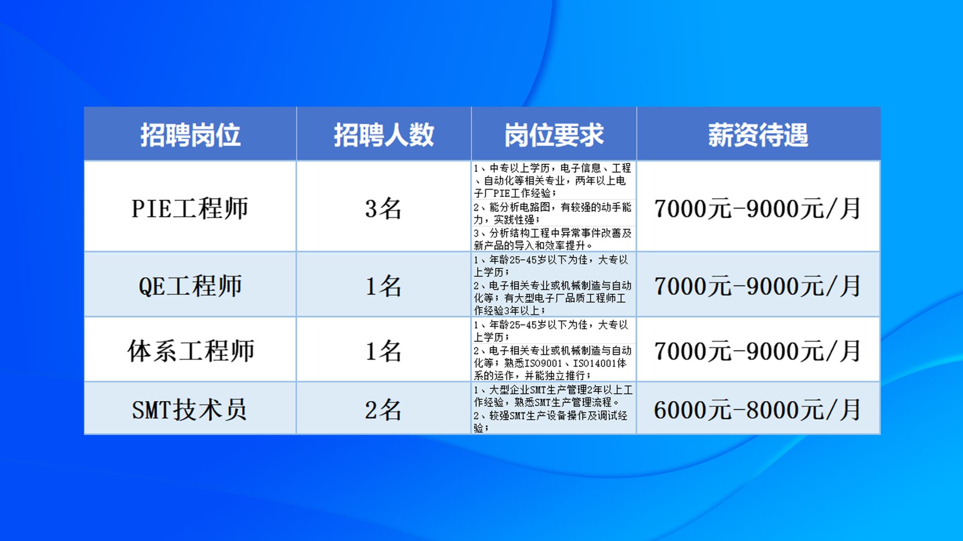 大专及以上学历,35岁以下,身体健康;工作时间:工作时间:5天8小时;22天工作制,其余时间参照劳动法支付加班费;综合工资3000-6000元,享有餐补、全勤奖、工龄奖、法定带薪假、婚假、年假、学历补贴、节日福利等。恒温无尘车间,适合年轻人稳定发展。