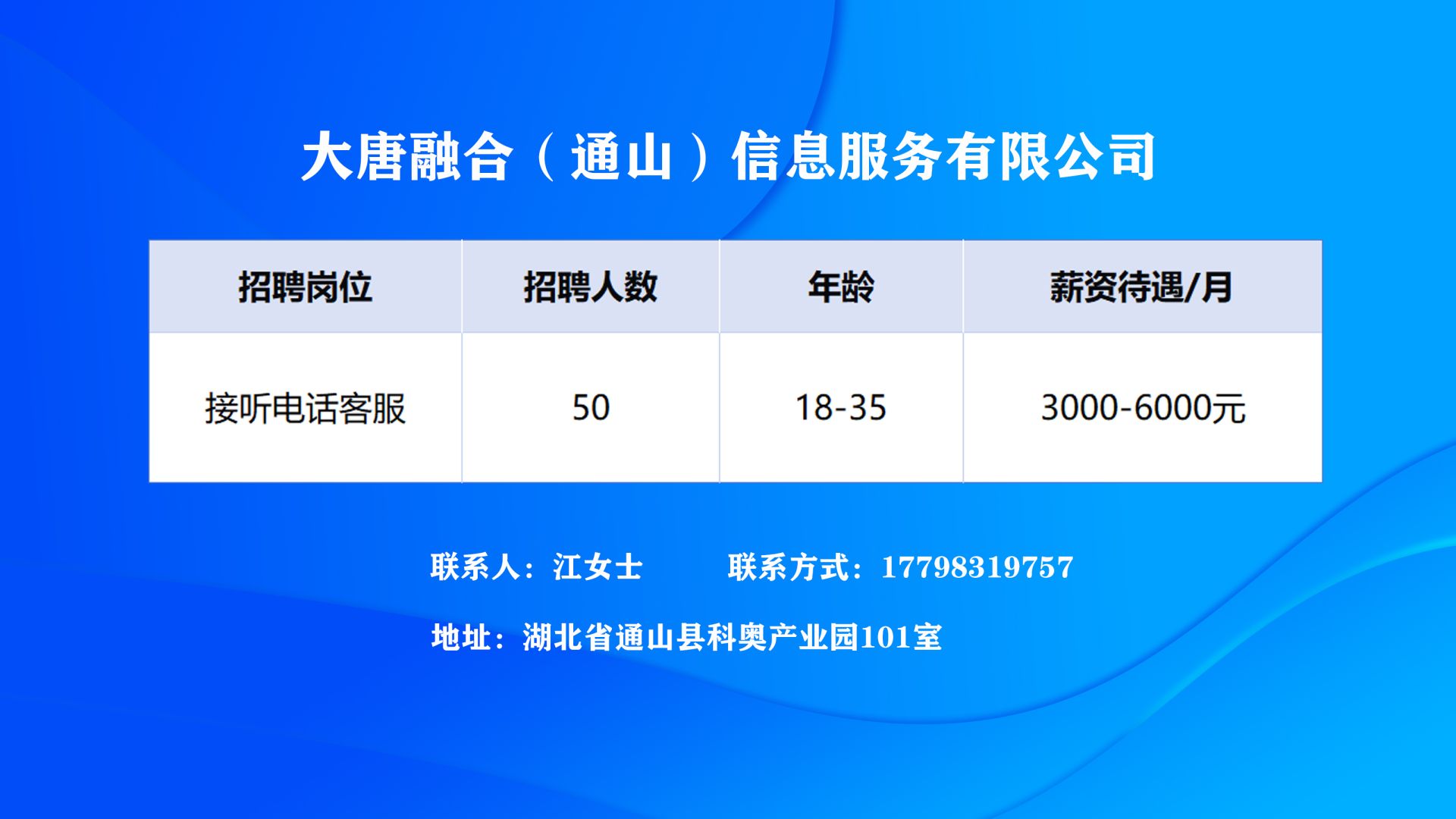 大唐融合(通山)信息服务有限公司,是由中国信科集团旗下大唐信服科技有限公司于2019年7月16日注册成立;主要服务于全国运营商、互联网、金融保险、政务服务等政企客户,为服务对象提供专业、专注、责任、创新的呼叫中心座席外包、物理座席外包、资源外包等BPO服务。公司致力于打造具有影响力的“通山服务外包基地”,并完成与本地企业、院校、政府对接,形成产业聚集效应,充分利用本地劳动力与场地资源,以产业扶贫为重点,扶持发展地方现代服务业,为全县人才提供就业岗位。