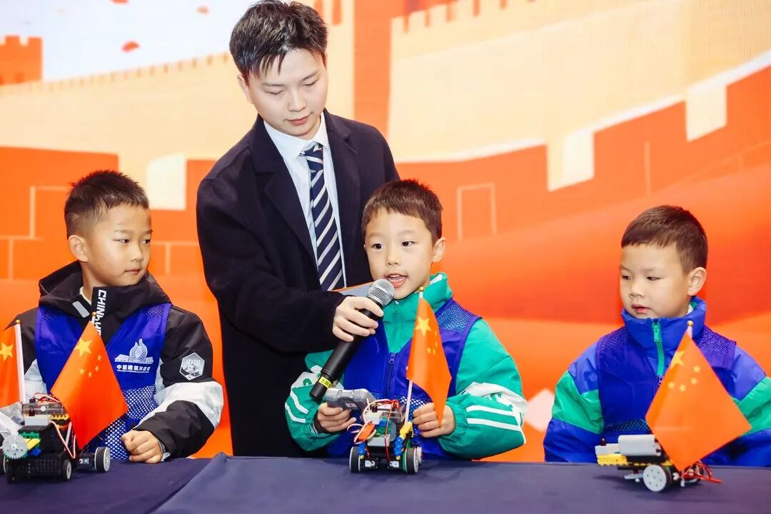 “我做的坦克车跑得又直又快,还有能转动的炮筒”“在我的坦克里可以看电视”“我的坦克底部能感应障碍,可以扫雷!”他们一边演示,一边用稚气却清晰的声音阐述设计巧思。“小小坦克手,大大强国梦,保卫祖国,奋发向上!”的口号洋溢着他们对科技与家国的热情。