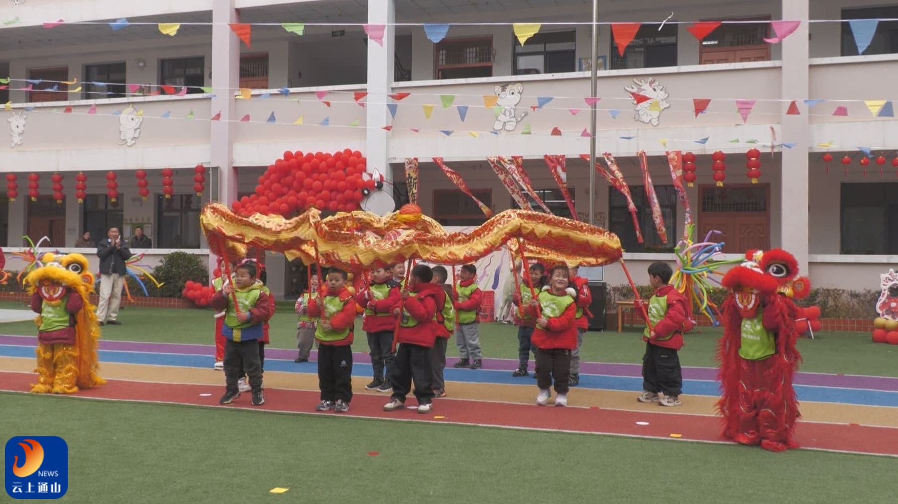 活动现场暖意融融,家长与孩子们欢聚一堂,共赴迎新之约。伴随着欢快的旋律,全体教师身着喜庆服饰登场,以一支《欢欢喜喜过大年》开场舞正式拉开活动帷幕,瞬间点燃现场气氛;腰鼓表演《盛世欢腾》节奏铿锵有力,尽显童真活力;民俗舞狮、龙灯巡等演轮番亮相,让大家沉浸式感受传统年俗的独特魅力。此外,拔河竞技、写对联、剪窗花等丰富的亲子互动项目有序开展,在欢声笑语中拉近了亲子距离,赢得现场一致好评。