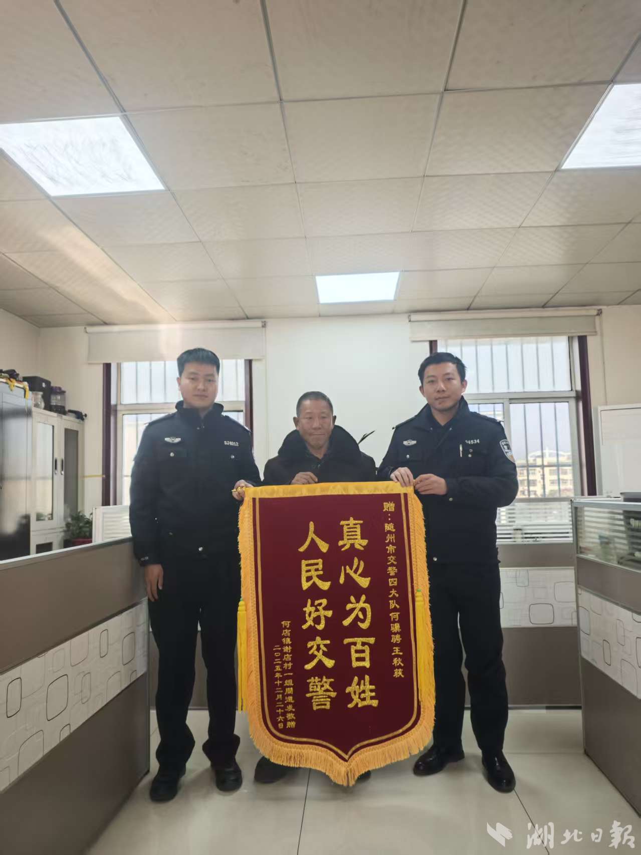 湖北日报讯(通讯员解超、李月仙)近日,群众周师傅将一面写有“真心为百姓 人民好交警”的锦旗,送到随州市公安局交通管理支队事故处理大队办案民警何骥骋手中,对办案民警在交通事故处理中耐心、细致、公正的调解工作表示感谢。