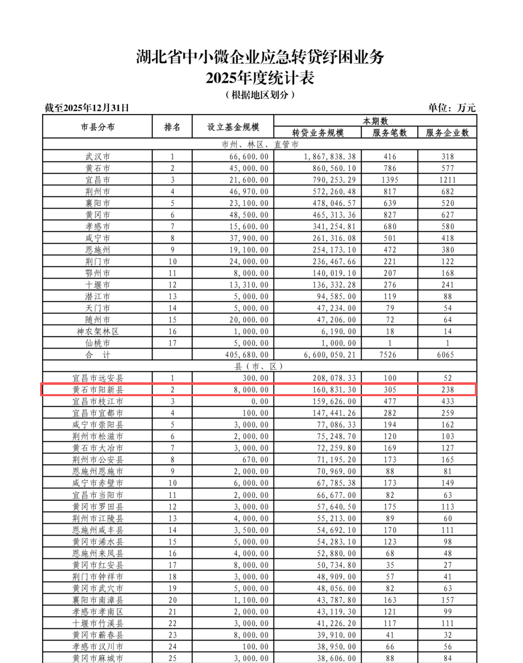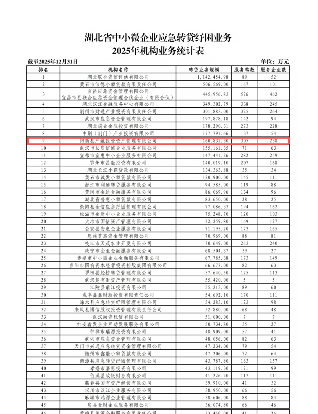 湖北日报客户端讯(通讯员骆涛)就在刚刚出炉的《湖北省中小微企业应急转贷纾困业务2025年度统计表》中,阳新产投作为优化营商环境的核心金融服务窗口,为238家中小微企业提供应急转贷服务305次,转贷续贷资金规模16.08亿元,位于全省县(市、区)第二,在“十四五”收官之年,以实实在在的金融支持助力县域经济高质量发展,交出了一份合格的答卷。